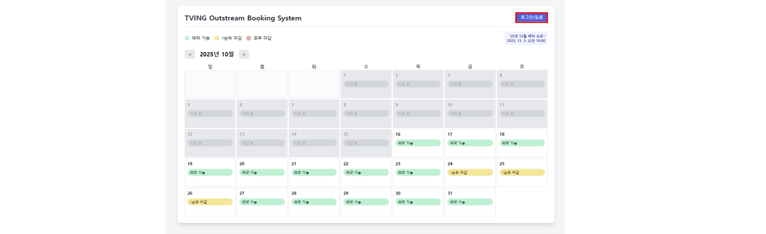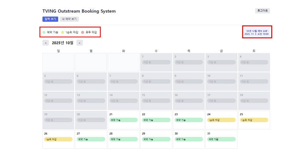 (*아웃스트림 예약시스템 우측 상단에서 익월 예약 오픈일정을 확인할 수 있습니다.)