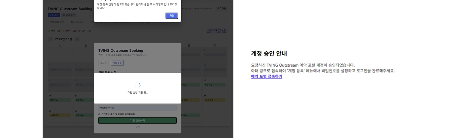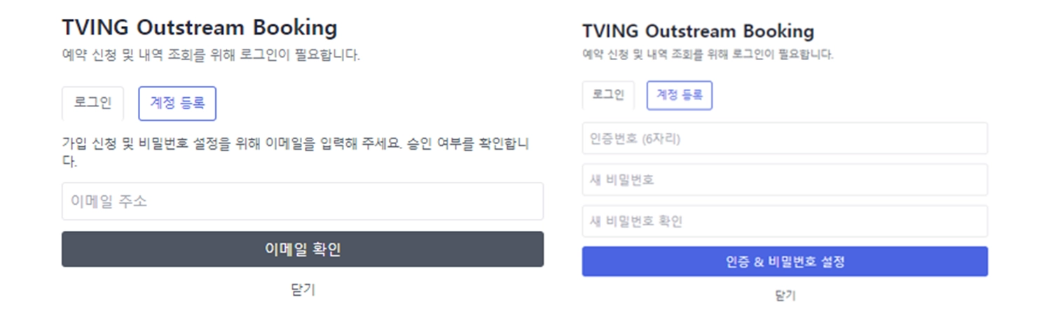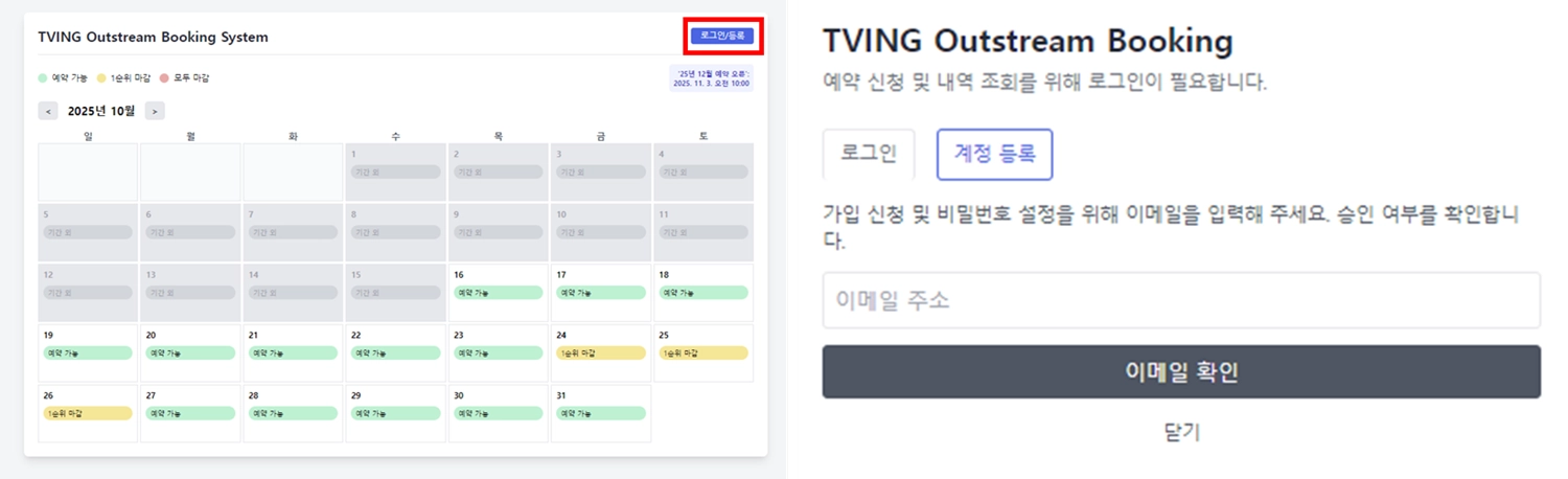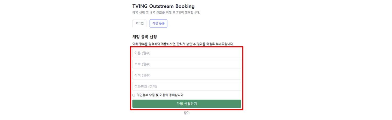 TAS 계정과는 별개로, 아웃스트림 예약 시스템 내 신규 계정 등록이 필요합니다.